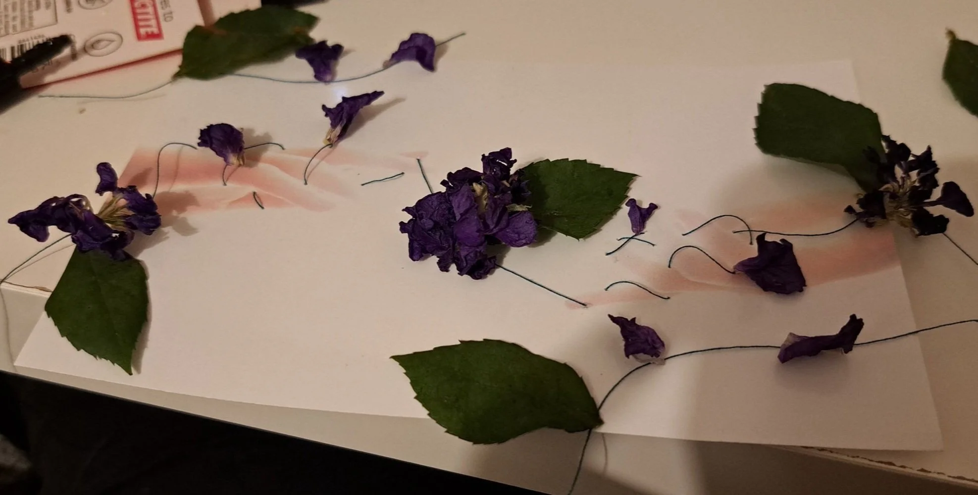 I printed this image and poked holes into it with a needle before threading green thread through the holes. The green thread alone was too plain, so I added dried flowers and leaves as if they were growing from the thread, flourishing from the connection between the hands. I scanned this back onto my computer and used Photoshop masking to remove the background so the leaves, flowers, and thread could be added to the original high-quality image rather than the reduced printed image.